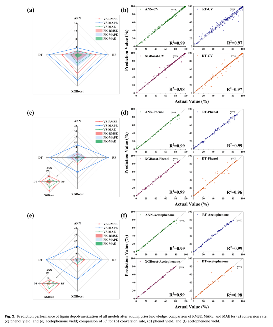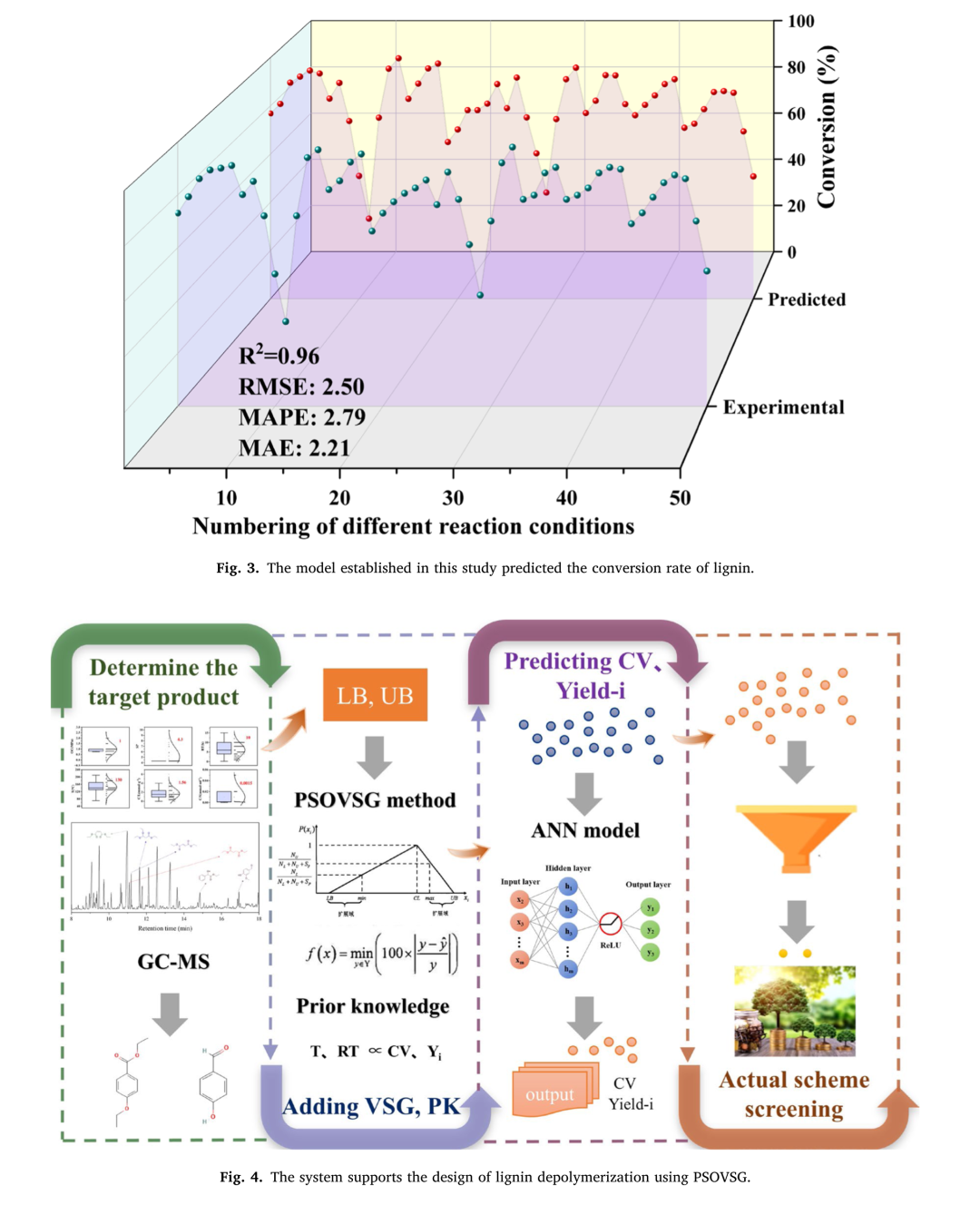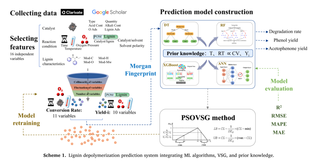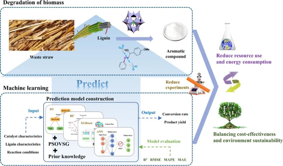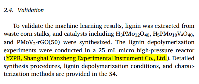 生物质作为一种可再生碳资源,在应对日益严峻的能源危机方面具有巨大潜力。其中,木质素作为生物质的关键组分,可通过多金属氧酸盐催化转化为高价值化合物,相关的木质素解聚实验在 25 mL 微型高压反应釜(YZPR-25,上海岩征实验仪器有限公司)中进行。然而,传统方法在催化剂选择和反应优化过程中依赖反复试验,不仅导致化学试剂的高消耗,还造成资源、能源与时间的显著浪费。为解决这一问题,本研究整合机器学习技术,开发了木质素解聚的预测建模与逆向设计系统,用于优化催化剂选择及反应条件。在所评估的模型中,人工神经网络(ANN)表现好,对木质素转化率及苯酚 / 苯乙酮产率的预测 R? 值分别达到 0.91、0.90 和 0.90;引入虚拟样本生成(VSG)及先验知识后,模型预测精度显著提升,平均 R? 值从 0.66 提高至 0.98。本研究为木质素解聚提供了一种更高效、更经济的方法,有助于提高资源利用率,为可持续发展做出贡献。